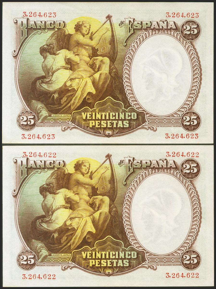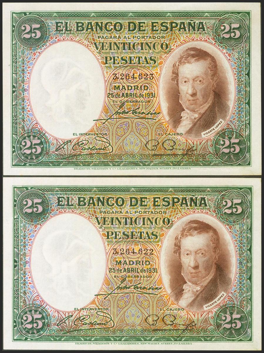 25 Pesetas. 25 de Abril de 1931. Pareja correlativa. Sin serie. (Edifil 2021: 358). Apresto original. SC.