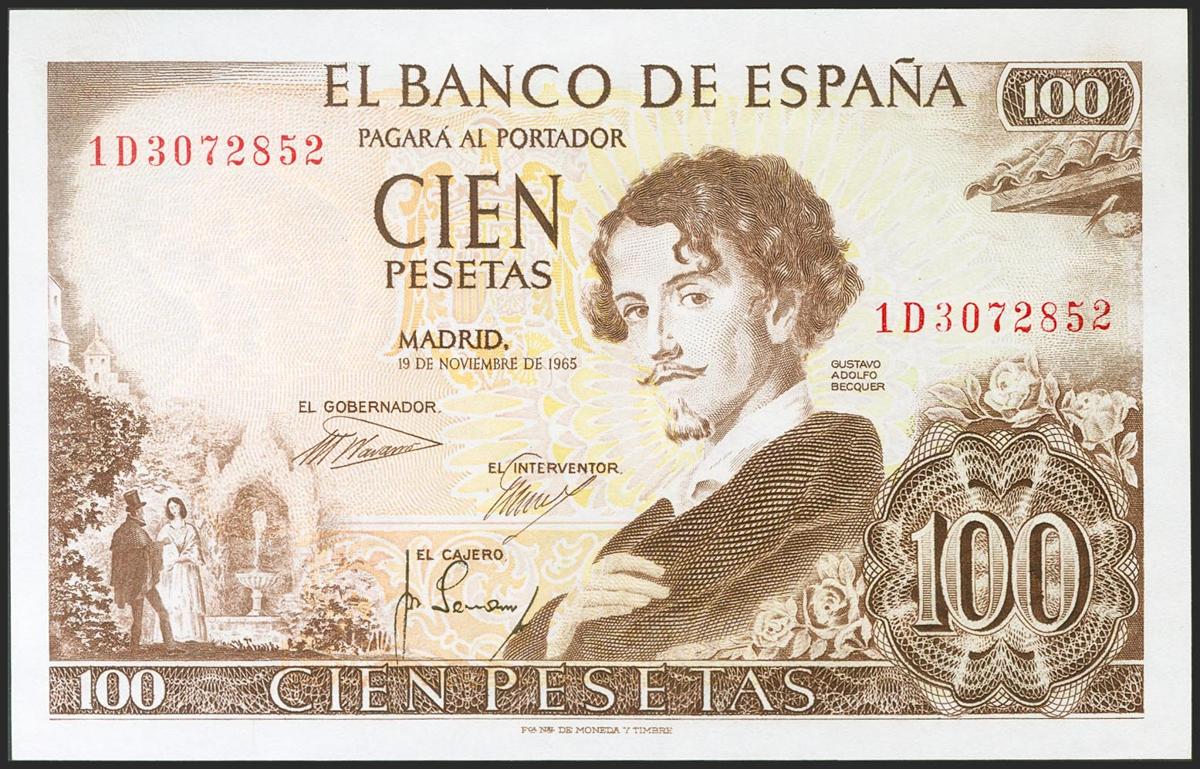 100 Pesetas. 19 de Noviembre de 1965. Serie 1D. (Edifil 2021: 470a). Apresto original. SC.