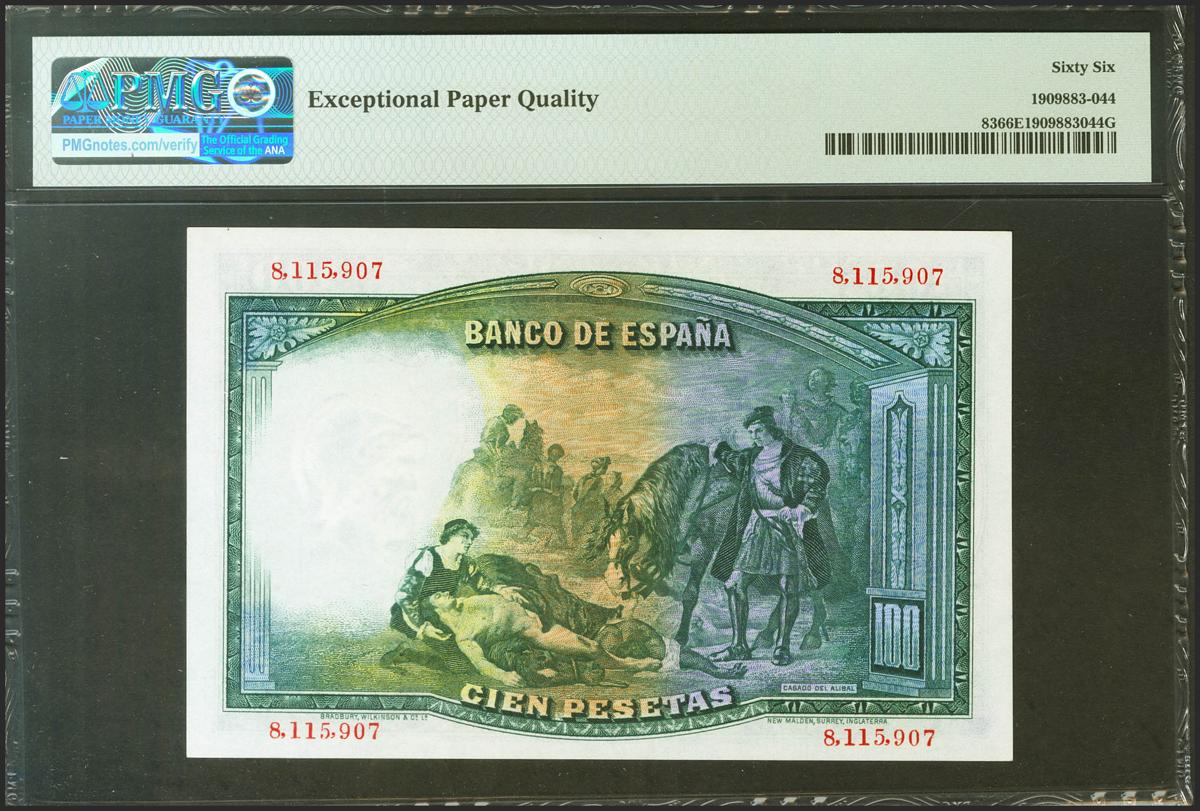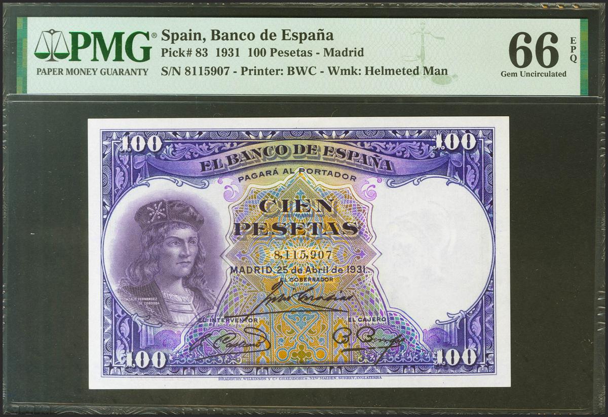 100 Pesetas. 25 de Abril de 1931. Sin serie. (Edifil 2021: 360, Pick: 83). Raro en esta excepcional calidad, apresto original. SC. Encapsulado PMG66EPQ.