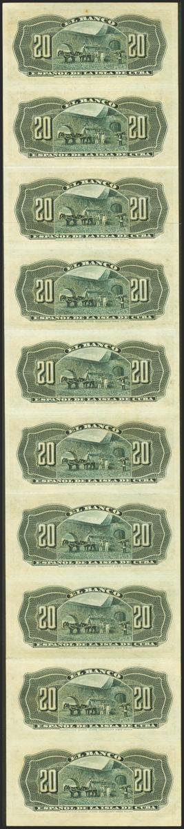 BANCO ESPAÑOL DE LA ISLA DE CUBA. 20 Centavos. 15 de Febrero de 1897. Serie I. (Edifil 2017: 85). Pliego completo de 10 billetes. Inusual. SC/SC-.