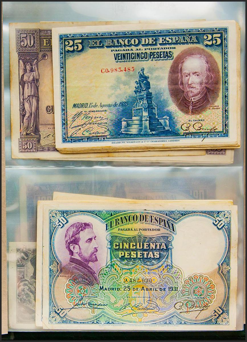 Muy interesante conjunto de centenares de billetes emitidos por el Banco de España de diferentes épocas y calidades, incluyendo varios ejemplares de Papel de Finanzas y una pequeña representación de billetes locales. SC-/MBC-. IMPRESCINDIBLE EXAMINAR.