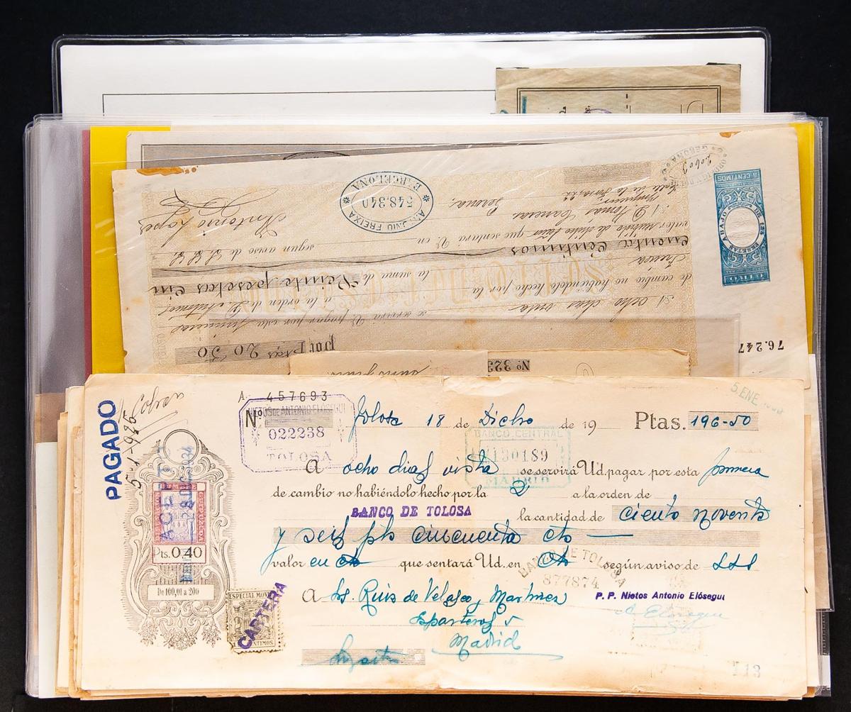 Interesante conjunto de Letras de Cambio principalmente de las primeras décadas del siglo XX tasadas con los diferentes Timbres de Estado Fiscales correspondientes (Giro, Móvil, Facturas y Recibos, Foralidades, etc), algunas de ellas libradas en el extranjero y cobradas en bancos españoles con las tasas de cada país, incluye un "PROTESTO" por impago y algún documento de cambio sin utilizar. A EXAMINAR.