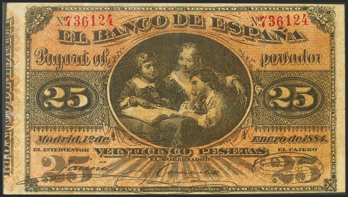 25 Pesetas. 1 de Enero de 1884. Falso de Epoca. Sin serie. (Edifil 2021: 282F). Muy raro e interesante, profesionalmente restaurado en el pliegue vertical. MBC+.