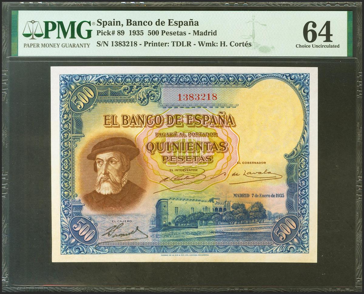 500 Pesetas. 7 de Enero de 1935. Sin serie. (Edifil 2021: 365, Pick: 89). Inusual. SC. Encapsulado PMG64.