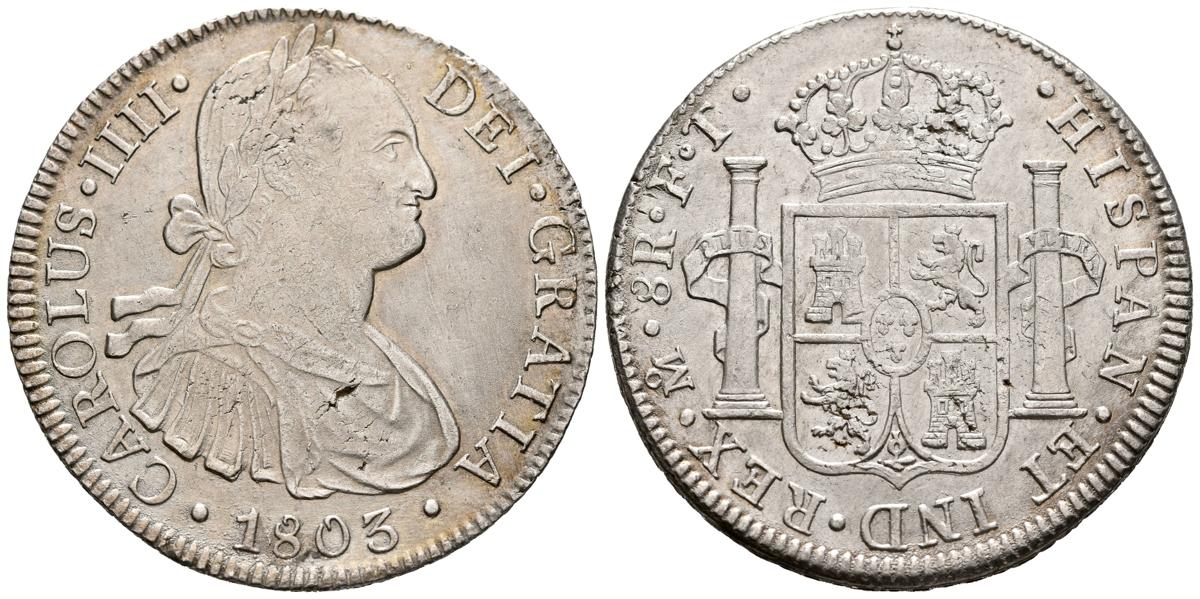CARLOS IV (1788-1808). 8 Reales. (Ar. 26,93g/39mm). 1803. Mexico FT. (Cal-2019-977). EBC-. Metal agrietado y ligeras rayitas. Escasa así.