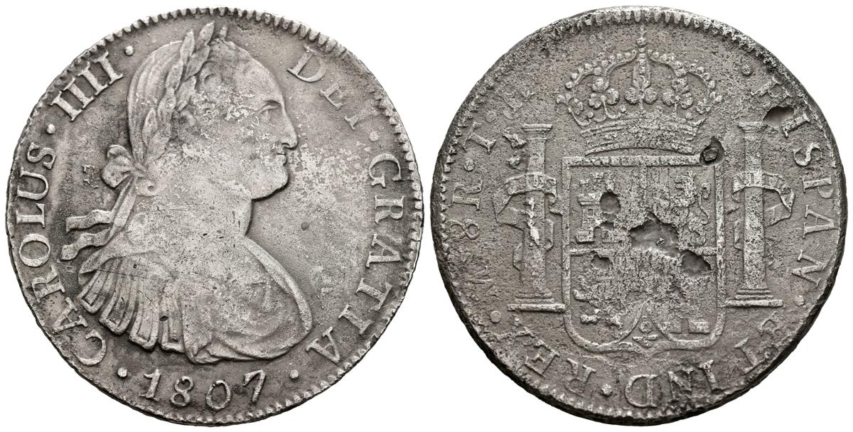 CARLOS IV (1788-1808). 8 Reales. (Ar. 25,89g/39mm). 1807. México TH. (Cal-2019-984). MBC-. Oxidaciones limpiadas.