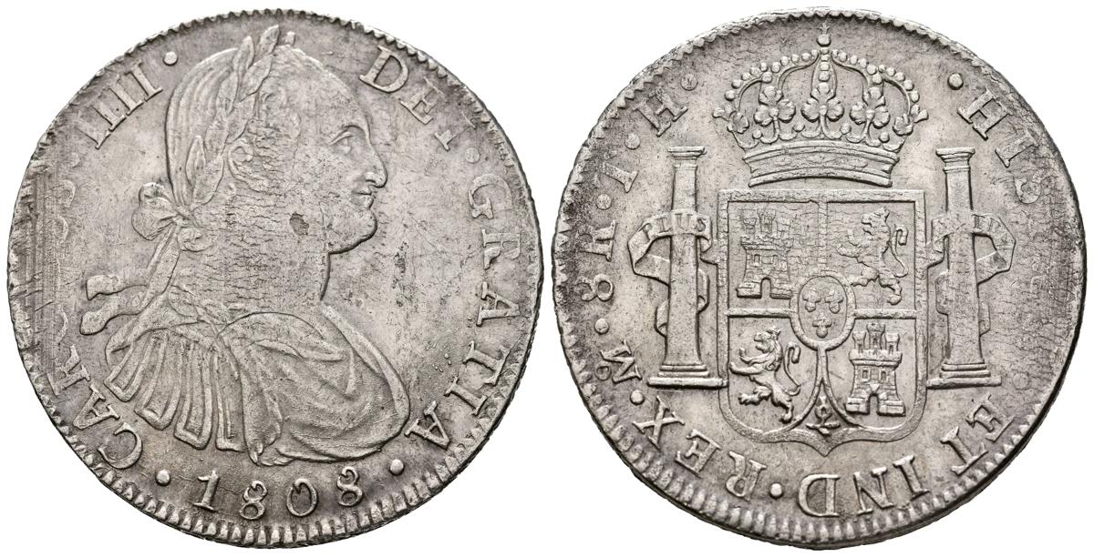 CARLOS IV (1788-1808). 8 Reales. (Ar. 27,01g/39mm). 1808. Mexico TH. (Cal-2019-988). MBC+/EBC-. Plata agrietada. Vanos de acuñación. Bonito ejemplar.