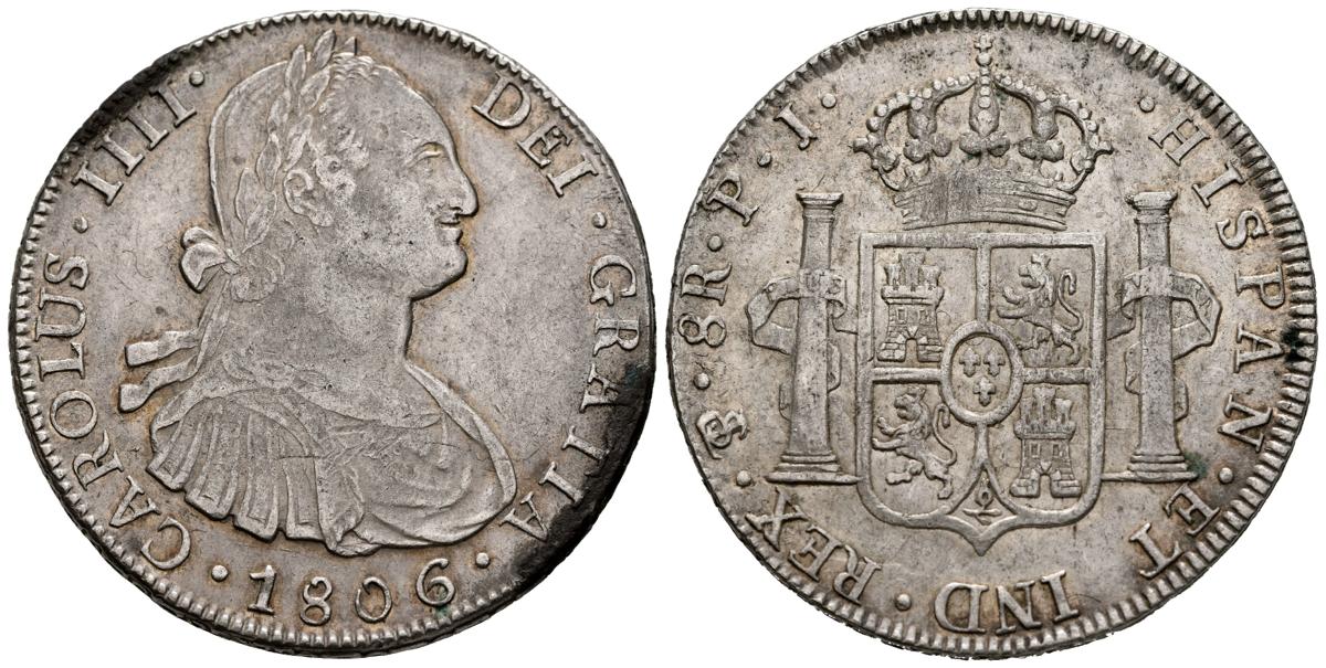 CARLOS IV (1788-1808). 8 Reales. (Ar. 27,02g/39mm). 1806. Potosí PJ. (Cal-2019-1012). MBC. Bonita pátina.
