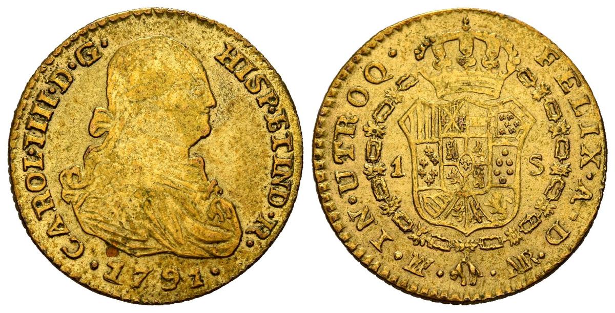 CARLOS IV (1788-1808). 1 Escudo. (Metal blanco sobredorado. 1,98g/18mm). 1791. Madrid ALR. (Cal-2019-1108). Falsa de época. Ensayador imposible. MBC-.
