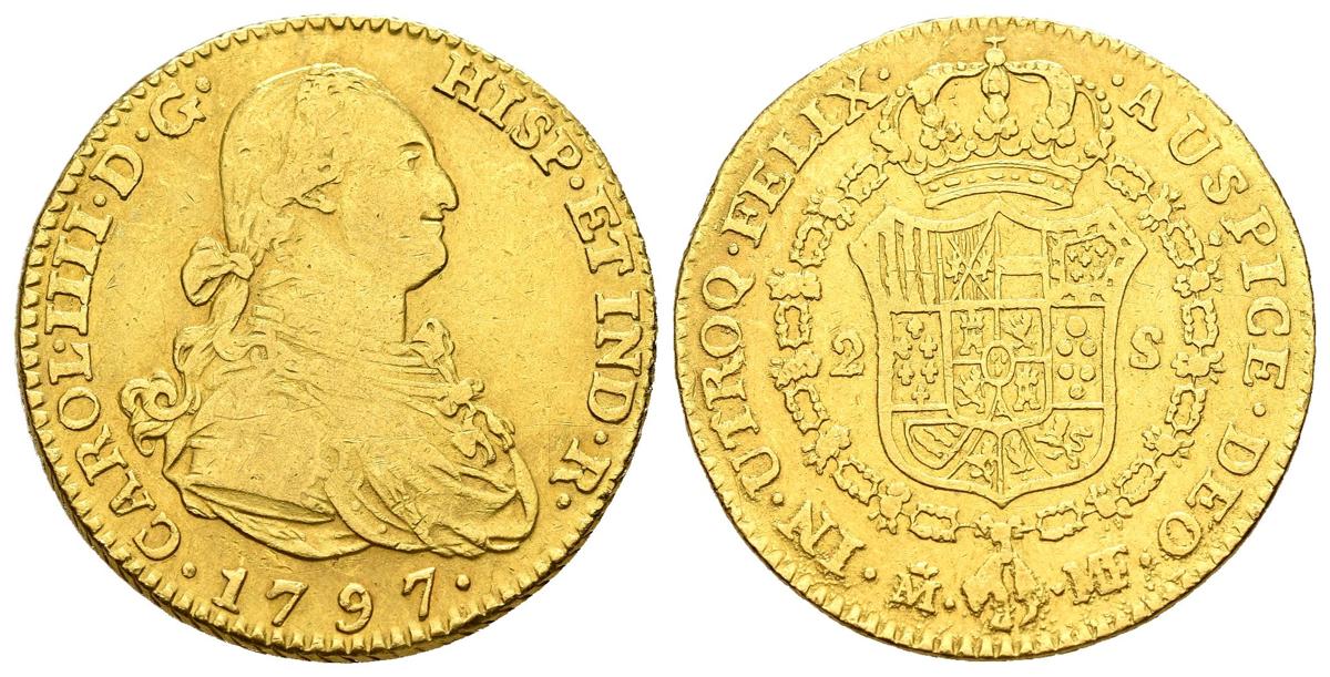 CARLOS IV (1788-1808). 2 Escudos. (Au 6,71g /22mm). 1797. Madrid MF. (Cal-2019-1289). MBC. Golpe en el canto a las 12h.