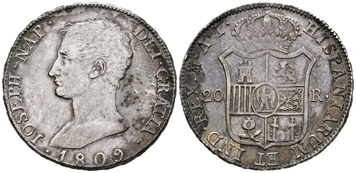 JOSÉ NAPOLEÓN (1808-1813). 20 Reales (Ar. 27,09g/40mm). 1809. Madrid AI. (Cal-2019-36). Águila grande. MBC+. Preciosa pátina.