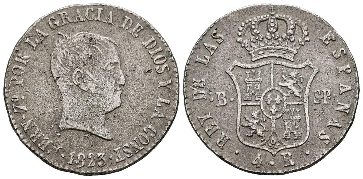 FERNANDO VII (1808-1833). 4 Reales (acuñada en módulo de 2 Reales). (Ar. 5,72g/25mm). 1823. Barcelona SP. (Cal-2019-722). Falsa de época. MBC+.