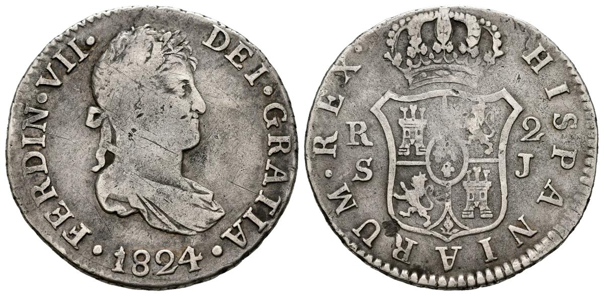 FERNANDO VII (1808-1833). 2 Reales. (Ar. 5,66g/27mm). 1824. Sevilla J. (Cal-2019-955). BC+.