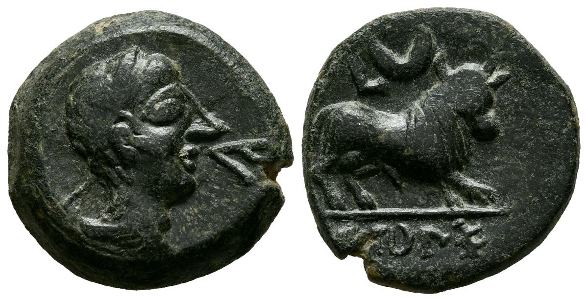 CASTULO (Cazlona, Jaén). Semis. (Ae. 4,68g/18mm). 180 a.C. (FAB-722). Anv: Cabeza masculina diademada a derecha, delante letra ibérica: Ca. Rev: Toro a derecha, encima letra L y creciente, en exergo leyenda ibérica: CaSTeLe. MBC.