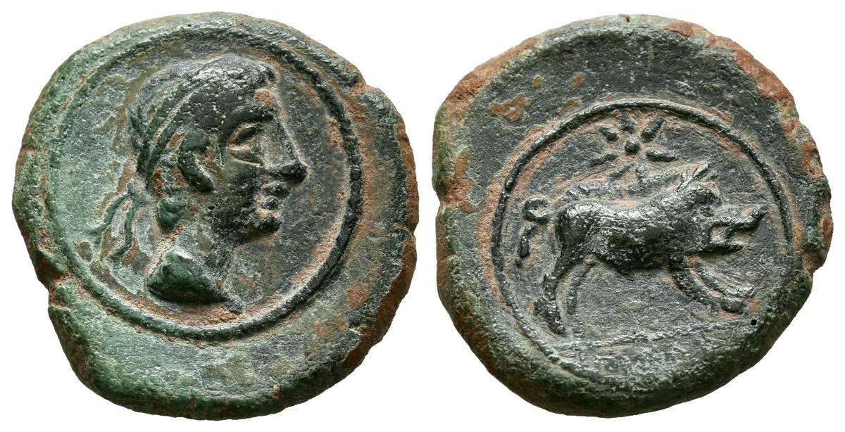 CASTULO (Cazlona, Jaén). Cuadrante. (Ae. 3,24G/17mm). 180 a.C. (FAB-735). Anv: Cabeza masculina diademada a derecha. Rev: Jabalí a derecha, encima estrella, debajo de línea leyenda ibérica: CaSTeLE. EBC. Bonito ejemplar.