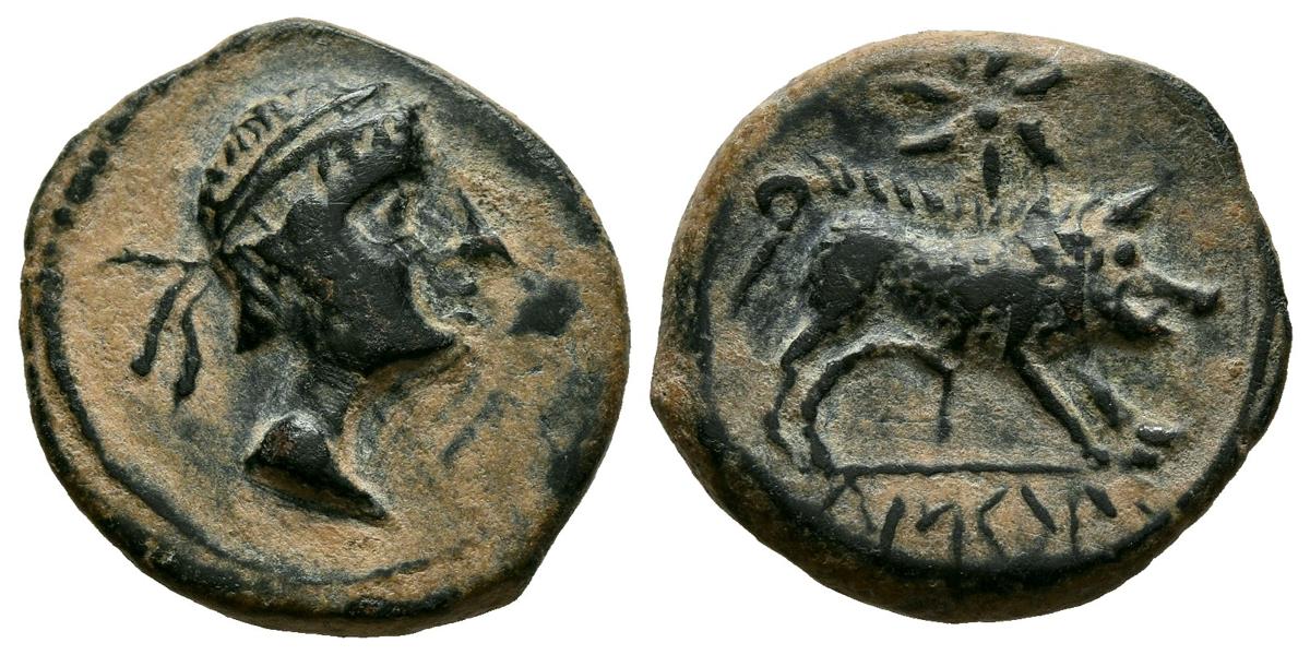 CASTULO (Cazlona, Jaén). Cuadrante. (Ae. 2,96g/17mm). 180 a.C. (FAB-736). Anv: Cabeza masculina a derecha, delante letra ibérica Ca. Rev: Jabalí a derecha, encima estrella, debajo leyenda ibérica CaSTeLE. MBC/MBC+.