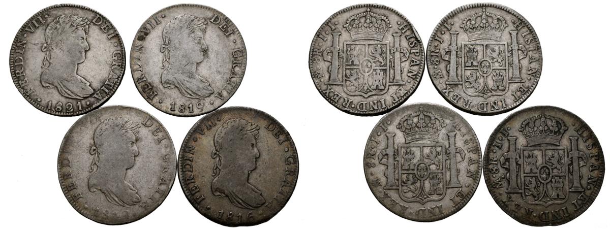 FERNANDO VII (1808-1833). Conjunto de 4 monedas de 8 Reales acuñados en México con fechas de 1816, 1819 (2) y 1821. Diferentes estados de conservación. A EXAMINAR.