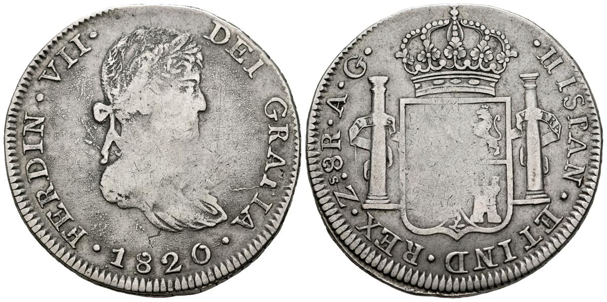 FERNANDO VII (1808-1833). 8 Reales. (Ar. 26,80g/39mm). 1820. Zacatecas AG. (Cal-2019-1463). BC.