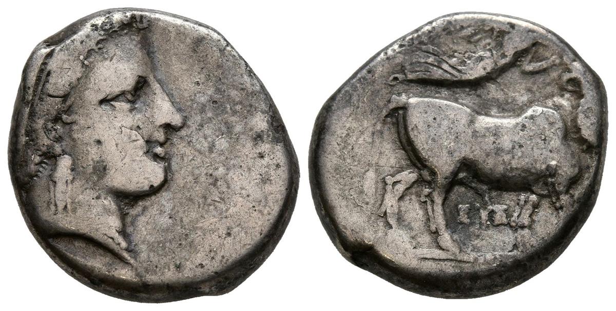 CAMPANIA, Neapolis. Didracma. (Ar. 7,13g/19mm). 300 a.C. (HN Italy 577). Anv: Cabeza didemada de ninfa a derecha. Rev: Toro con cabeza masculina a derecha, encima Nike volando a derecha, entre sus patas monograma, debajo leyenda. MBC.