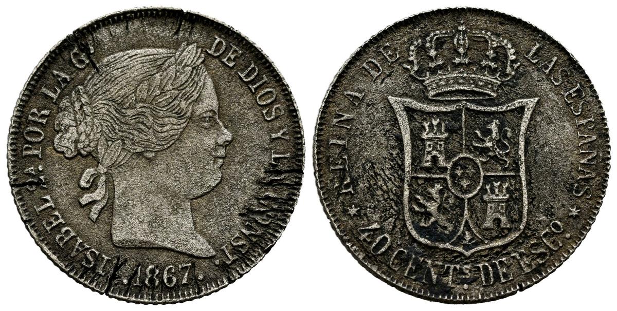 ISABEL II (1833-1868). 40 Céntimos de Escudo. (Ar. 3,97g/ 23mm). 1867. Madrid. (Cal-2019-502). Falsa de época. MBC-.