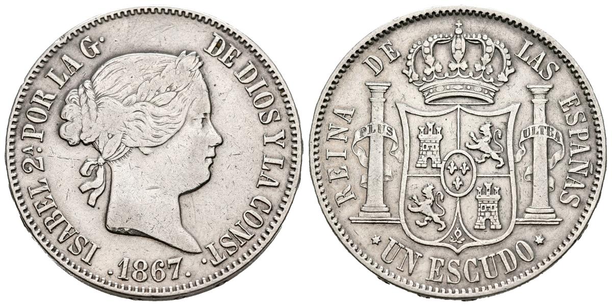 ISABEL II (1833-1868). 1 Escudo. (Ar. 12,88g /29mm). 1867. Madrid. (Cal-2019-565). MBC. Limpiada.