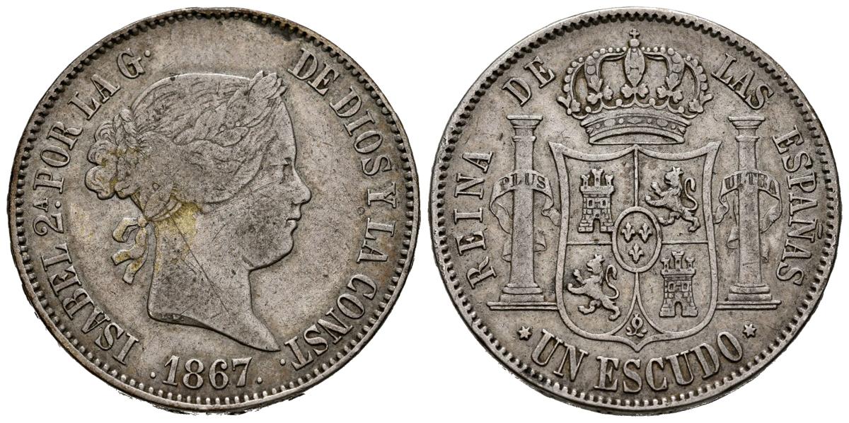 ISABEL II (1833-1868). 1 Escudo. (Ar. 12,89g/30mm). 1867. Madrid. (Cal-2019-565). MBC-/MBC.