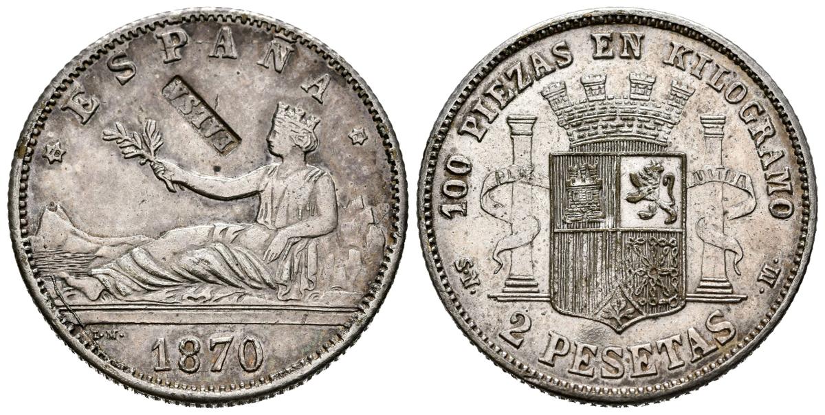 GOBIERNO PROVISIONAL (1868-1871). 2 Pesetas (Ar. 8,24g/27mm). 1870 *18-70. Madrid SNM. (Cal-2019-24). Falsa de época marcada como tal. EBC-.