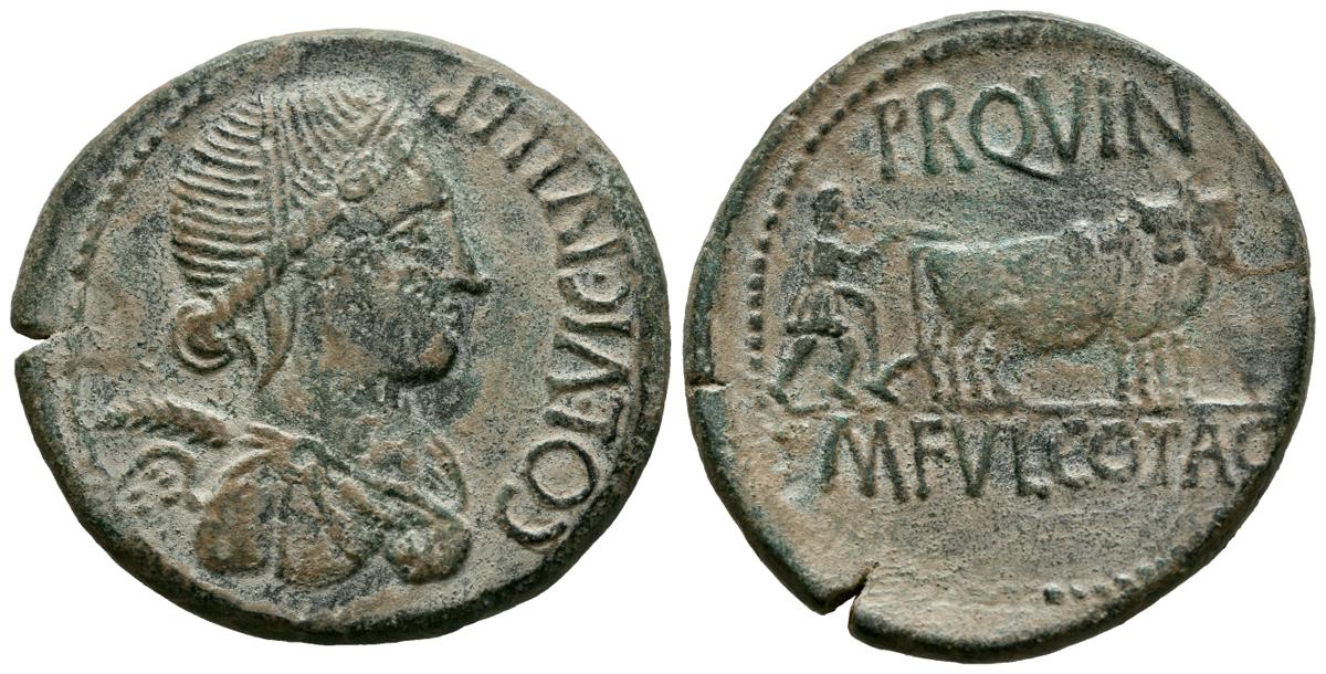 CELSE (Velilla del Ebro, Zaragoza). As. (Ae. 13,02g/33mm). 50-30 a.C. (FAB-796). Anv: Busto femenino a derecha con palma, delante leyenda: COL VIC IVL LEP. Rev: Yunta a derecha, encima leyenda: PR QVIN, debajo leyenda: M FVL C OTAC. MBC+.