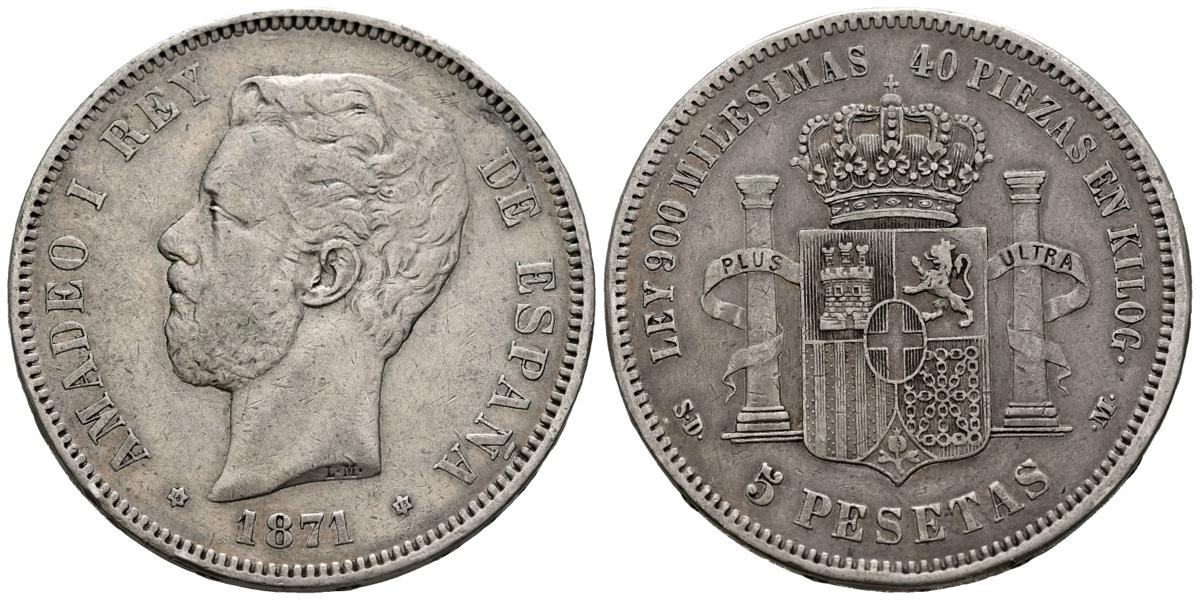 AMADEO I (1871-1873). 5 Pesetas. (Ar. 24,85g/37mm). 1871 *18-18. Madrid SDM. (Cal-2019-6). MBC-. Escaso ejemplar.