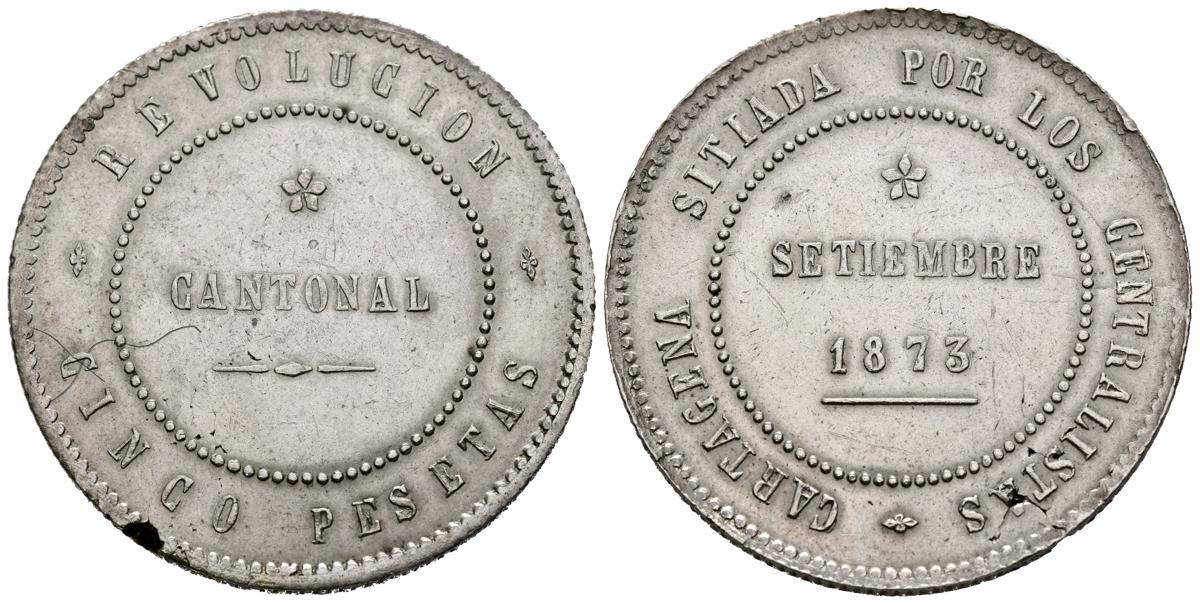 REVOLUCIÓN CANTONAL (1873-1874). 5 Pesetas. (Ar. 28,31g/37mm). 1873. Cartagena. (Cal-2019-7). 80 perlas en anverso y 85 en reverso coincidente. MBC+. Muesca en canto y típicas roturas de cuño de estas piezas.