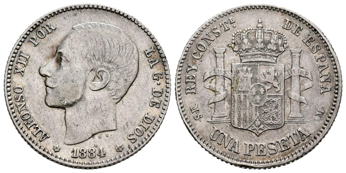 ALFONSO XII (1874-1885). 1 Peseta. (Ar. 4,98g /23mm). 1884 *18-84. Madrid MSM. (Cal-2019-23). MBC. Raro ejemplar y más así. Estrellas perfectamente visibles.