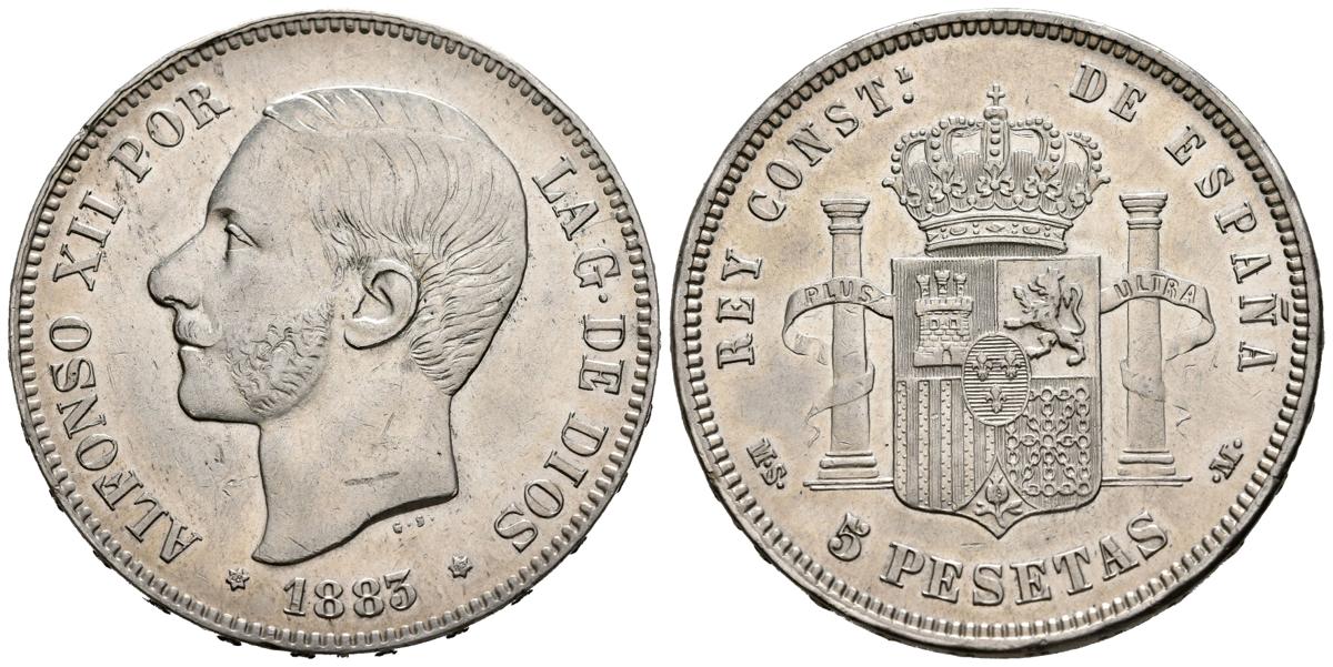 ALFONSO XII (1874-1885). 5 Pesetas. (Ar. 25,15g/37mm). 1883 *18-83. Madrid MSM. (Cal-2019-55). EBC. Marquitas. Restos de brillo original.