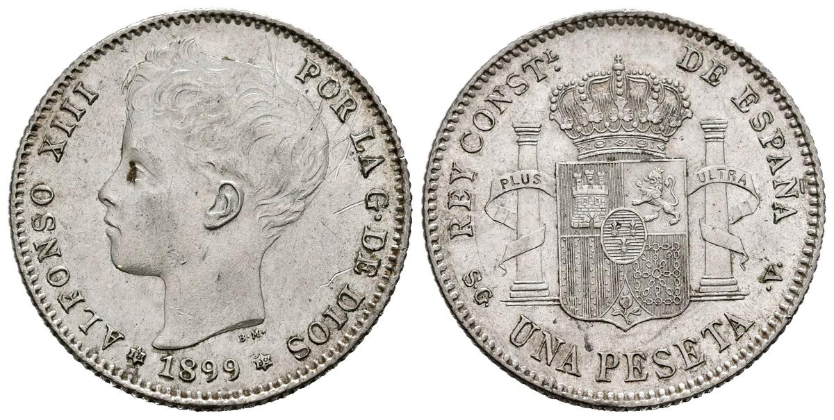 ALFONSO XIII (1885-1931). 1 Peseta. (Ar. 4,98g/23mm). 1899 *18-99. Madrid SGV. (Cal-2019-57). MBC+/EBC. Rayas en anverso.