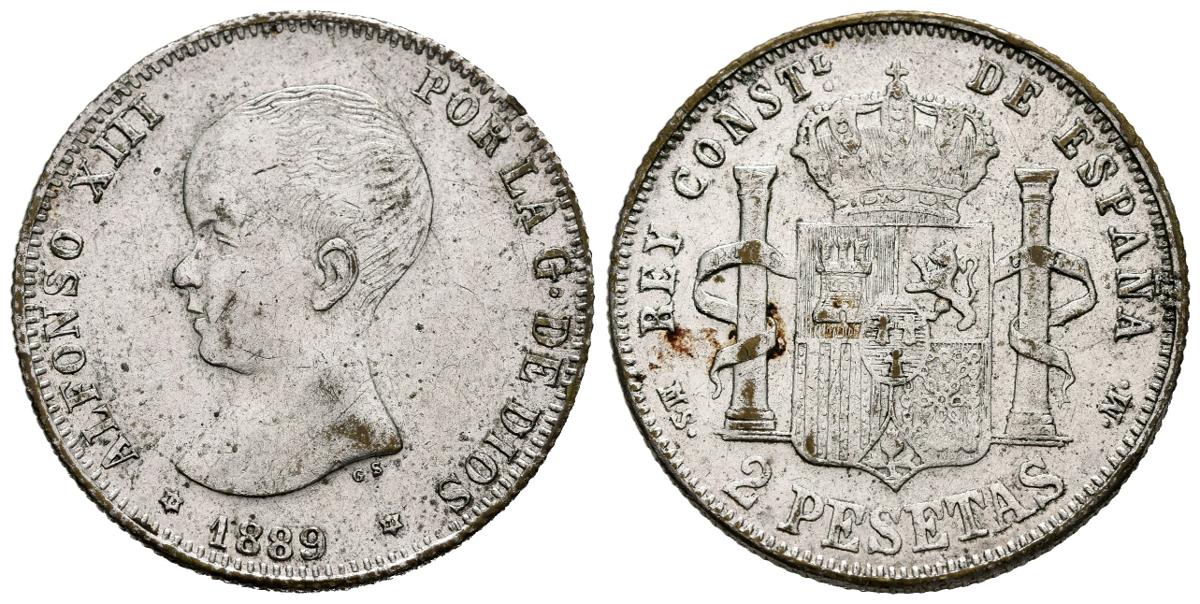 ALFONSO XIII (1885-1931). 2 Pesetas. (Metal Blanco. 8,19g /27mm). 1889 *18-89. Madrid MSM. (Cal-2019-82). Falsa de época. Ensayador imposible. MBC-.