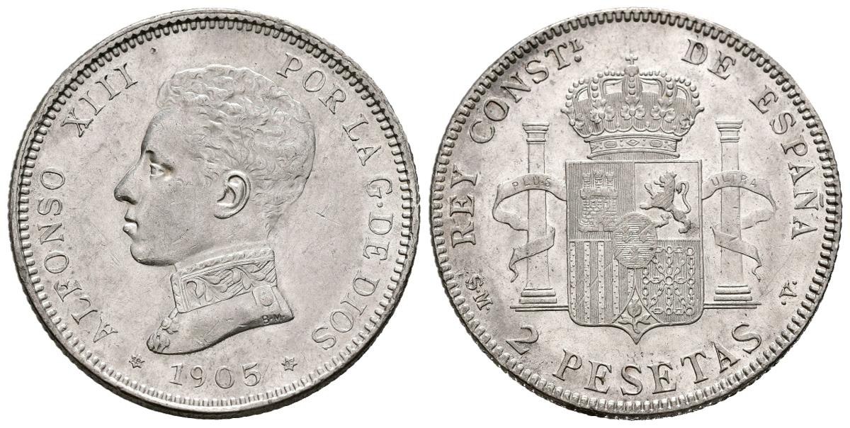 ALFONSO XIII (1885-1931). 2 Pesetas. (Ar. 9,87g/27mm). 1905 *19-05. Madrid SMV. (Cal-2019-88). SC-. Acuñación floja en reverso. Restos de brillo original.