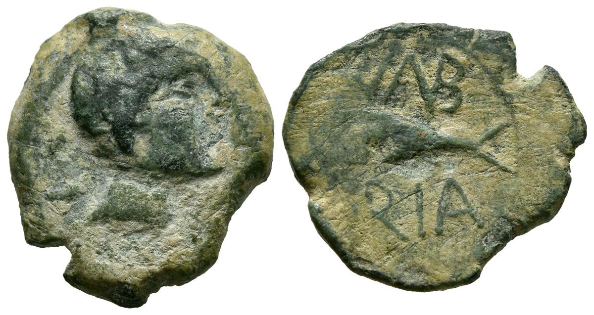 CUNBARIA (entre Cabezas de San Juan y Lebrija, Sevilla). Semis. (Ae. 4,68g/21mm). 50 a.C. (FAB-880). Anv: Cabeza masculina a derecha, detrás S. Rev: Atún a izquierda, entre leyenda: CVNBARIA. MBC.