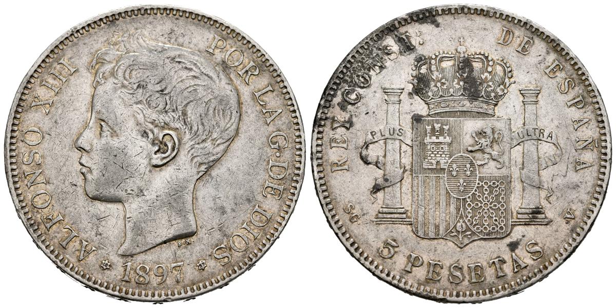 ALFONSO XIII (1885-1931). 5 Pesetas. (Ar. 24,90g/37mm). 1897 *18-97. Madrid SGV. (Cal-2019-107). MBC+.