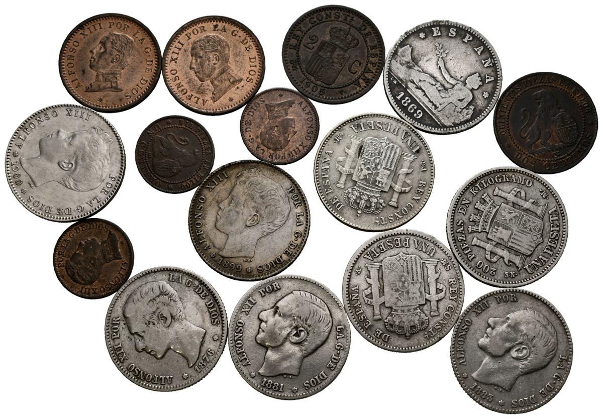 Atractivo conjunto de 16 piezas en cobre (1 y 2 Céntimos) y plata ( 9 monedas de 1 Peseta) acuñados entre la etapa del Gobierno Provisional y el reinado de Alfonso XIII. Incluye, entre otras piezas de interés, las Pesetas de 1876, 1881 y 1883. Diferentes estados de conservación, incluyendo piezas en alta graduación. Ninguna moneda repetida. A EXAMINAR.
