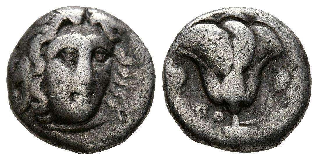 CARIA, Rodas. Hemidracma. (Ar. 1,55g/11mm). 305-275 d.C. (SNG Keckman 483.5). Anv: Cabeza de Helios mirando a derecha. Rev: Rosa, a ala izquierda PO. MBC-.