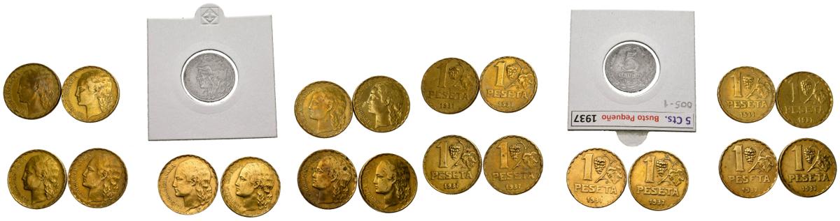 II REPUBLICA (1931-1939). Conjunto formado por 11 monedas, 10 piezas de 1 Peseta y 1 moneda de 5 Céntimos (busto pequeño), todas ellas acuñadas en 1937. EBC. A EXAMINAR.