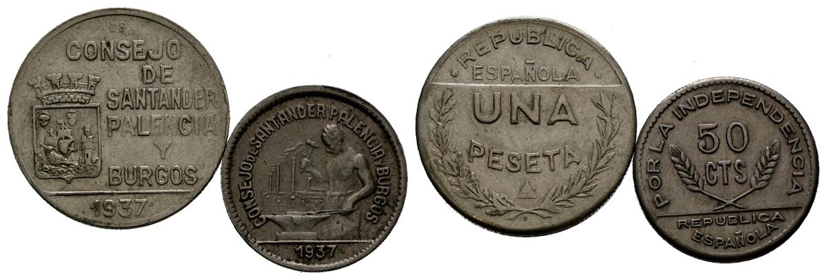 CONSEJO DE SANTANDER, PALENCIA Y BURGOS. Pareja de 50 Céntimos (sin PJR) y 1 Peseta. 1937. Diferentes estados de conservación. A EXAMINAR.