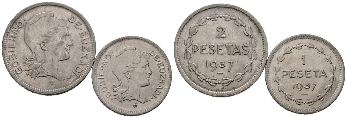 EUZKADI. Serie completa en niquel de 1 y 2 Pesetas acuñadas en 1937. (Cal-2019-14/15). Diferentes estados de conservación. A EXAMINAR.