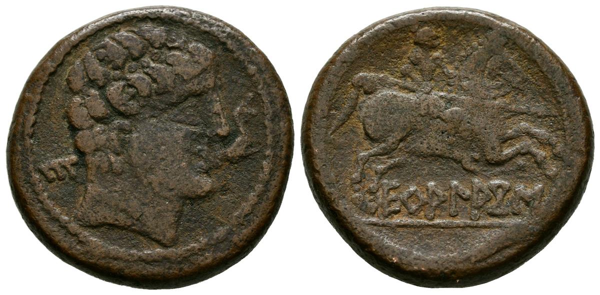 ECUALACOS (Zona de Soria-Guadalajara). As. (Ae. 12,95g/25mm). 120-20 a.C. (FAB-969). Anv: Cabeza masculina a derecha, delante delfín, detrás letra ibérica: E. Rev: Jinete con lanza a derecha, debajo leyenda: ECuALACoS. MBC-.