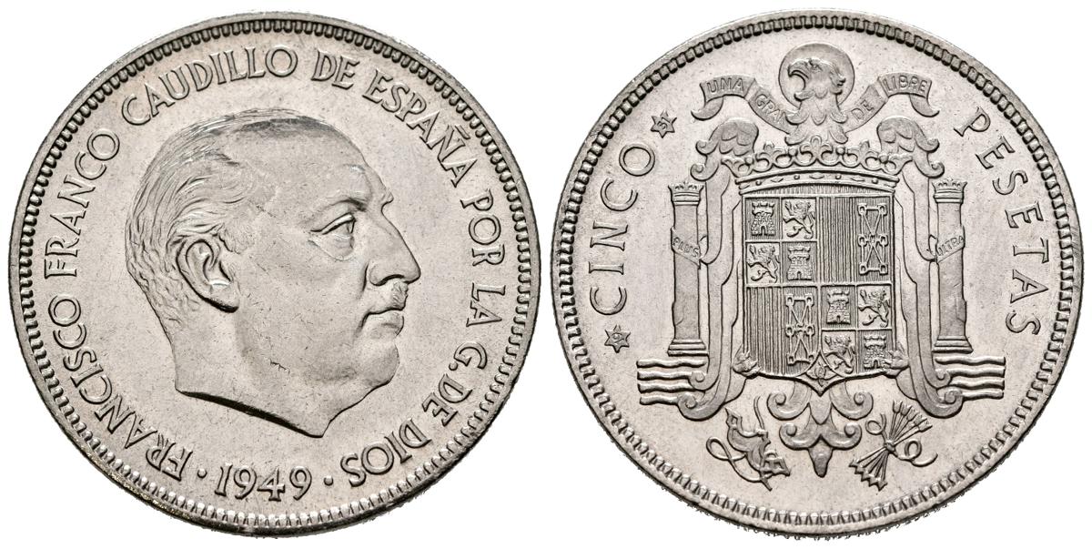 ESTADO ESPAÑOL (1936-1975). 5 Pesetas. (Ni. 15,01g/32mm). 1949 *19-51. Madrid. (Cal-2019-96). SC. Ligerísimas rayitas sin importancia en la mejilla y cuello del busto. Rarísimo y precioso ejemplar, conservando todo su brillo original.Ex Cayón Subastas 22/09/2021, Nº lote 6182.La ley de 16 de julio de 1949 ratificó la anterior de 1946 con la salvedad referente al material de acuñación empleado: la plata quedaba sustituida por el níquel. La idea de recuperar el icónico duro a imagen y semejanza de los acuñados entre el XVI y el XIX, se topó con el grave inconveniente de un país aún en postguerra. Con lo que no contaban las autoridades era con el súbito encarecimiento del níquel a principios del año 51, como consecuencia directa de la guerra de Corea, lo que provocó que se paralizaran prematuramente las acuñaciones de 1951 y 1952, prácticamente de níquel puro. Las emisiones de estos dos años quedaron reducidas a escasos ejemplares que nunca llegaron a circular y que, al parecer, fueron repartidas entre altos miembros del gobierno franquista. Nos encontramos, pues, ante una de las piezas más escasas y raras de la numismática del Estado Español que contrasta con la enorme producción que de estas mismas piezas se hicieron en 1949 y 1950. Hubo que esperar hasta 1957 para que se retomara la acuñación de los famosos duros o 5 Pesetas pero estos ya lo hicieron con un diámetro y peso notablemente inferiores.