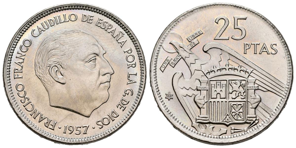 ESTADO ESPAÑOL (1936-1975). 25 Pesetas. (Ni. 8,16g/27mm). 1957 *73. Madrid. (Cal-2019-128). SC. Brillo original.