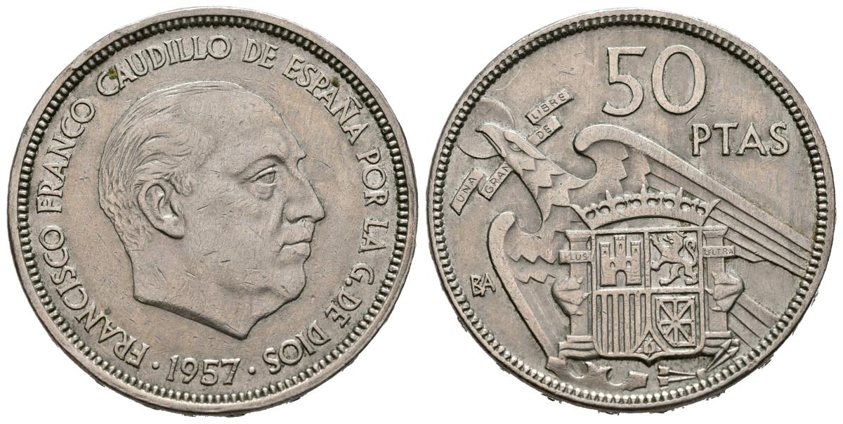 ESTADO ESPAÑOL (1936-1975). 50 Pesetas. (Ni. 12,70g/30mm). 1957 *BA. Barcelona. I Exposición Iberoamericana de Numismática y Medallística. (Cal-2019-156). MBC.