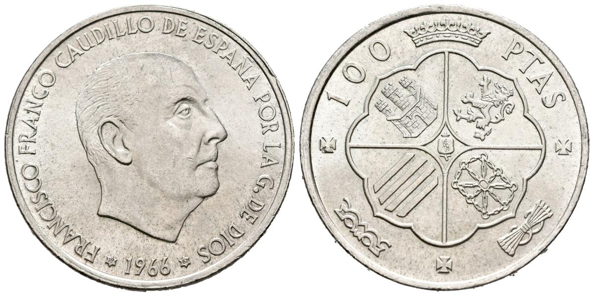 ESTADO ESPAÑOL (1936-1975). 100 Pesetas. (Ar. 19,15g/34mm). 1966 *19-66. Madrid. (Cal-2019-145). SC. Brillo original. Leves marquitas.