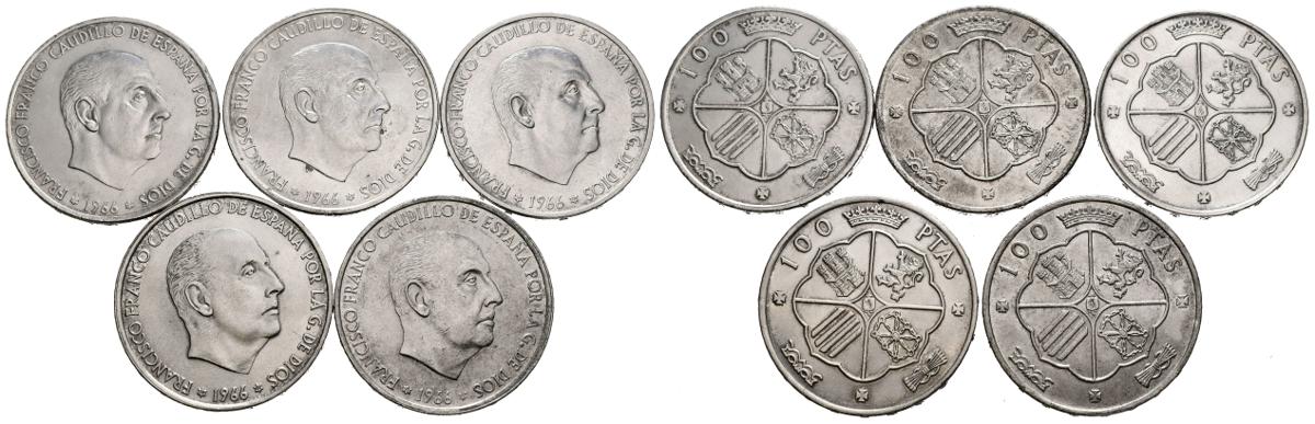 ESTADO ESPAÑOL (1936-1975). Serie numismática de las 100 Pesetas de 1966 (*66,67,68,69 manipulada, y 70). Alto nivel de conservación general. A EXAMINAR.