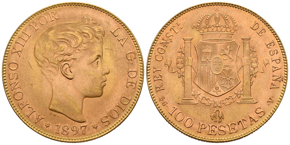 ESTADO ESPAÑOL (1936-1975). 100 pesetas. (Au. 32,26g /35mm). 1897 *19-62. Madrid SGV. Reacuñación Oficial de la FNMT. (Cal-2019-178). SC.
