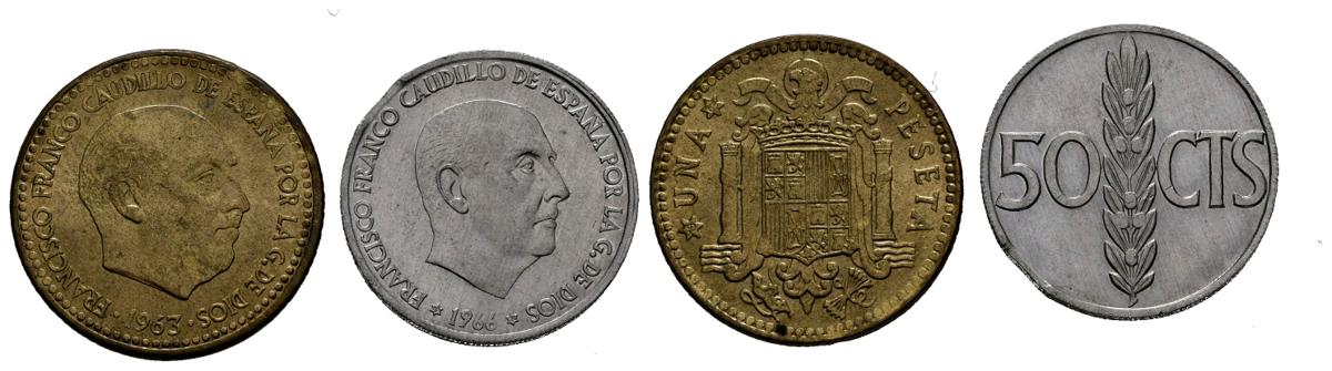 ESTADO ESPAÑOL (1936-1975). Conjunto de 2 monedas de 10 Céntimos (1966 *71) y 1 Peseta (1963 *64) con errores de segmentación y canto. EBC+. A EXAMINAR.